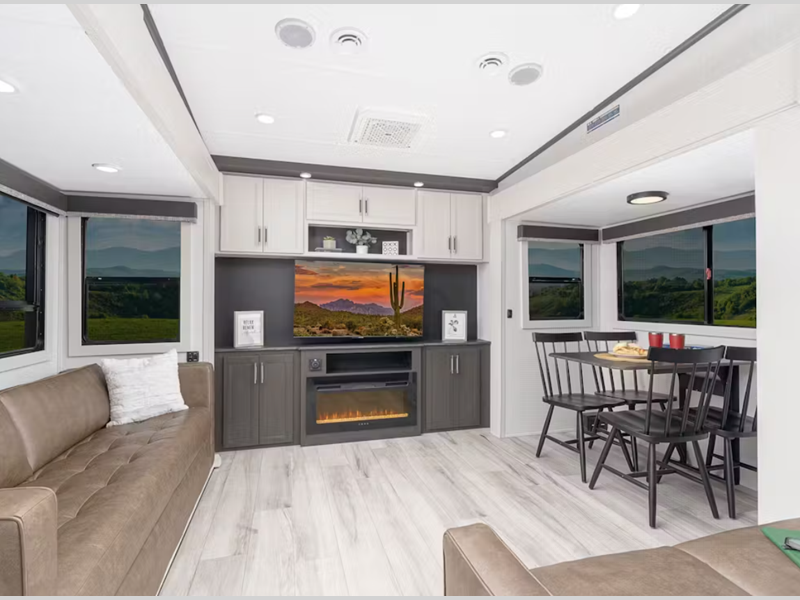 Sleeps 4 Slides 3 Length 35 ft 10 in Ext Height 13 ft 4 in Interior Color Hemp Hitch Weight 1955 lbs Dry Weight 10855 lbs Cargo Capacity 2645 lbs Fresh Water Capacity 95 gals Grey Water Capacity 88 gals Black Water Capacity 49 gals Tire Size ST235/80R16E Furnace BTU 35000 btu Available Beds King Refrigerator Type 12V Solar Friendly Refrigerator Size 16 cu ft Cooktop Burners 3 Shower Size 48" x 30" Number of Awnings 2 Axle Weight 6000 lbs LP Tank Capacity 30 lbs Water Heater Type On Demand AC BTU 15000 btu TV Info LR Smart 50" HD Flat Screen Awning Info 11' & 16' Power w/Adjustable Arms and LED Light Strip Axle Count 2 Washer/Dryer Available Yes Number of LP Tanks 2 Shower Type Standard Electrical Service 50 amp Similar Floorplans