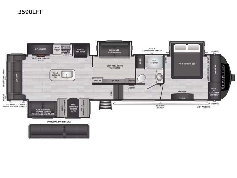 The main difference between this Sprinter Limited fifth wheel and model 3570LFT is that the slides in the living area are flip-flopped. This unit not only has a king-size bed up front in a private bedroom, but it also has a second bedroom with a queen-size tri-fold sofa. Above this second bedroom you'll also have more sleeping space in a loft with storage, and another tired camper can sleep on the 72" sofa out in the main living area. The kitchen offers you an island for more room while cooking and a pantry for your snacks. Sit down and eat a hot meal at the booth dinette with hinged storage access, and get even more comfortable on the full-reclining theater seating with massage, lights, and USB.