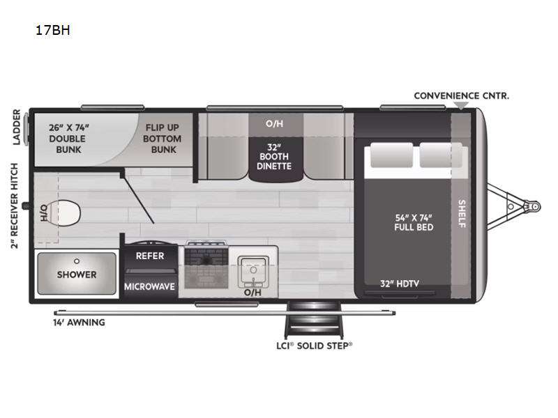 Travel to your favorite campgrounds with this stylish, compact, yet rugged trailer built for four or five campers! A full bed up front features drawers beneath for your clothing, plus there is a storage shelf above. With the 32" HDTV on the wall at the foot of the bed you can easily catch a move before you fall asleep or it can easily be viewed from the comfort of the booth dinette. Two more campers will enjoy the set of 26" x 74" bunk beds along the roadside back corner with flip-up bottom bunk for easy storage beneath. The opposite rear corner houses your private shower and toilet so you can skip the campground facilities! Cooking will be super convenient with a three-burner cooktop, a sink for cleaning up, and there is also a microwave located above the 12V refrigerator for your perishables. On the outside, a 14' awning provides added living space where you can set up your camp chairs and be protected from the sun and rain. There is also a ladder in back and a convenience center up front.
