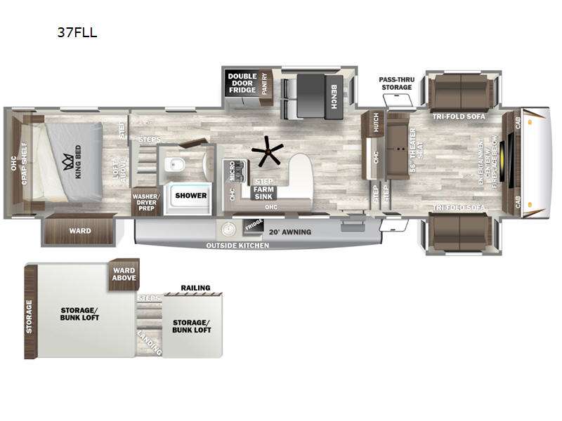 There is only one word that can describe this Sabre fifth wheel: fabulous! You will be amazed by the amount of comfort and convenience that is scattered all throughout this model for you and your family or friends. From the tri-fold sofa slides, the theater seating, the fireplace and entertainment center in the front living room to the rear bedroom with its king bed and wardrobe slide out, you will always have a place to relax and unwind. Not only that, but there is also a double loft area up above the bedroom and bath which has sleeping space, storage, a wardrobe, and railing for safety. The cook will enjoy the 12V refrigerator with French doors and pantry for all of your food storage needs, and the free-standing table with two chairs and a bench is the perfect place to sit down and enjoy a delicious meal or play board games.